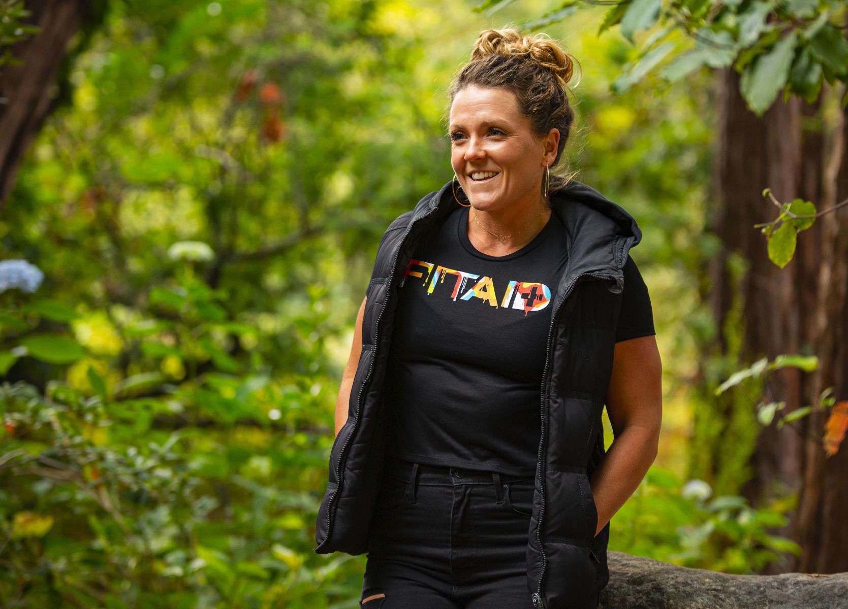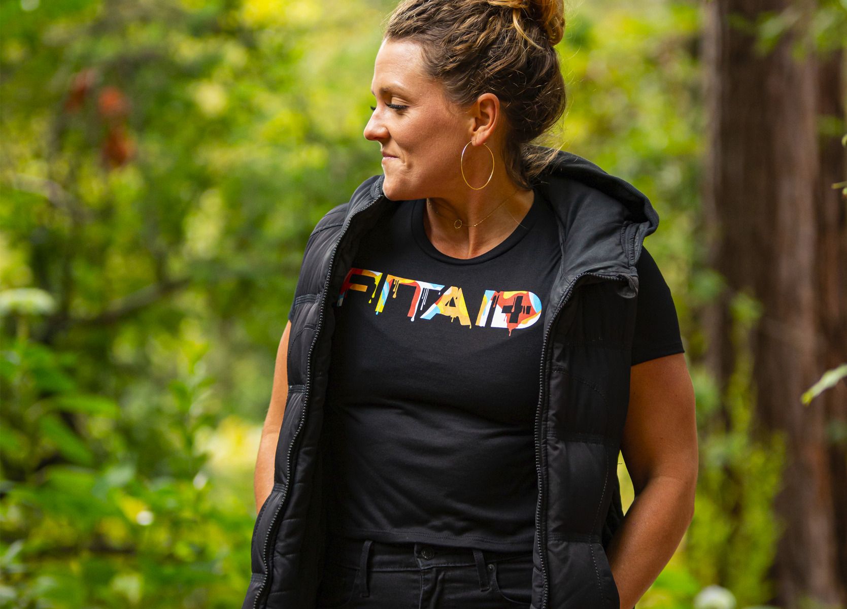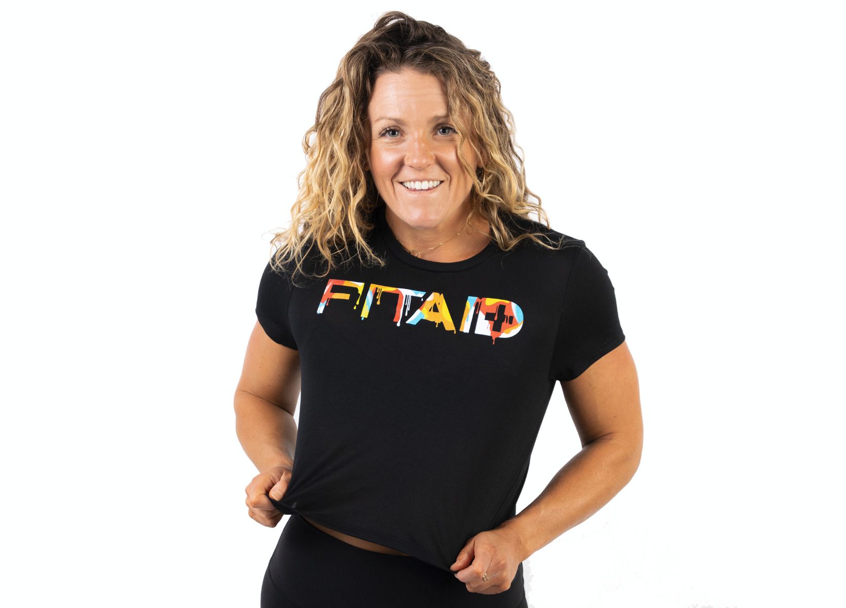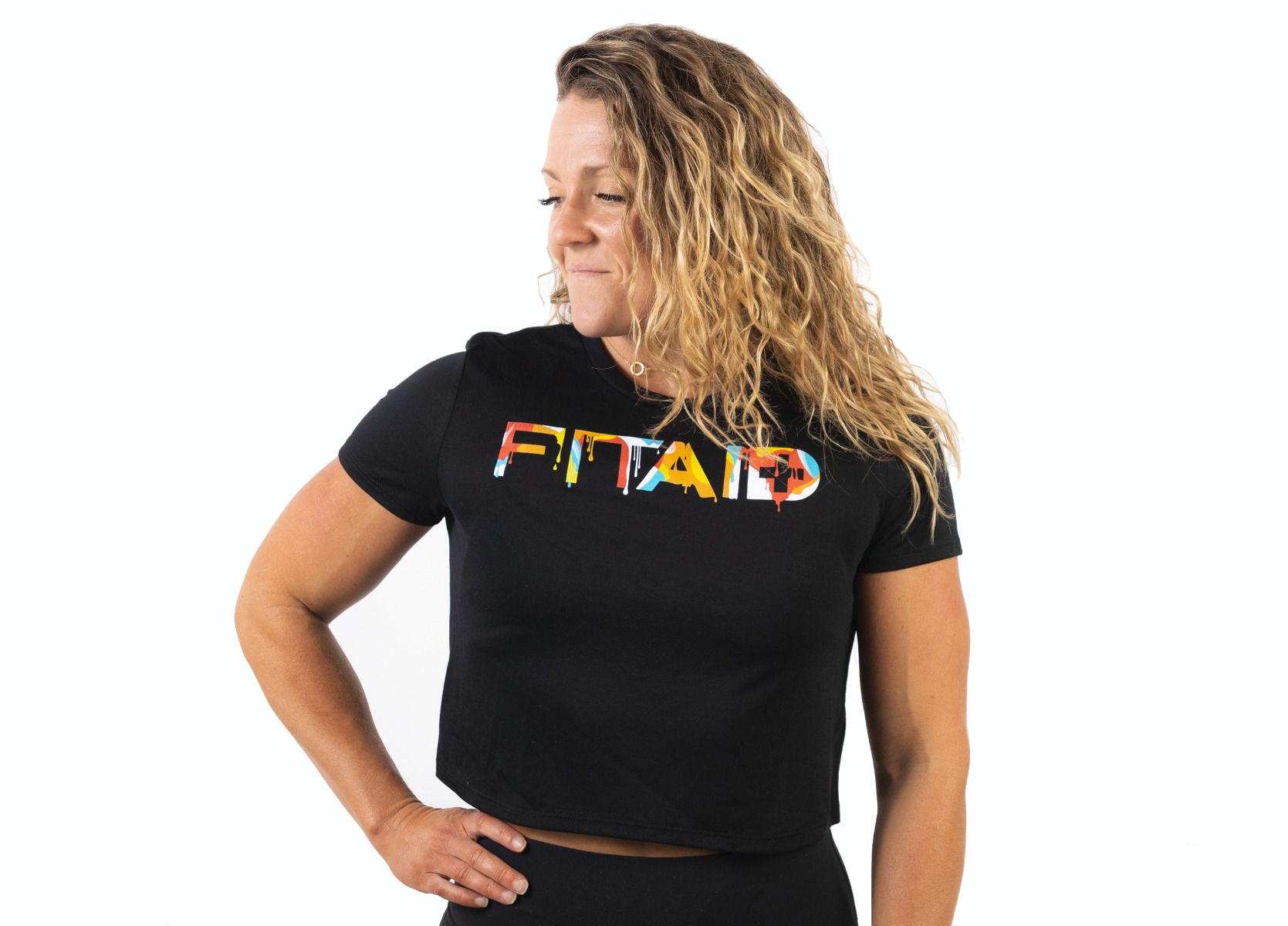 Now in a women's cropped version, these tees feature vibrant, colorful wet paint dripping from our FITAID logo, making this comfy black cotton blend T-shirt great for everyday wear or for turning heads at the gym. Model is 5'5" and is wearing size S.