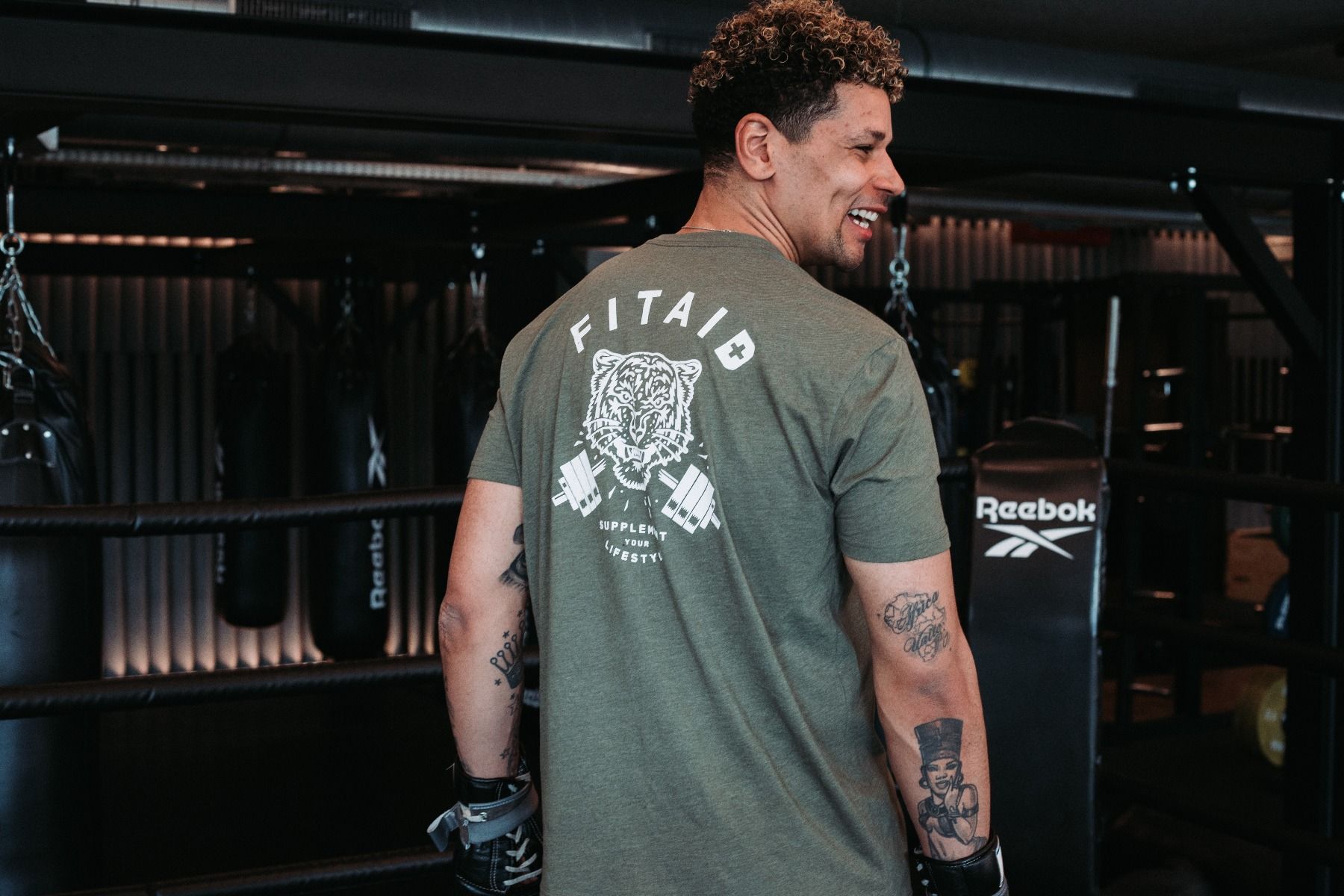 Back by popular demand, our classic bi-blend tiger t-shirt now comes in military green and white and features the FITAID barbell tiger on the front corner and full back. Hope you've honed your cat-like reflexes for all the compliments you're gonna receive while wearing this bad boy. Men's sizing. Original artwork by Brian Tong.